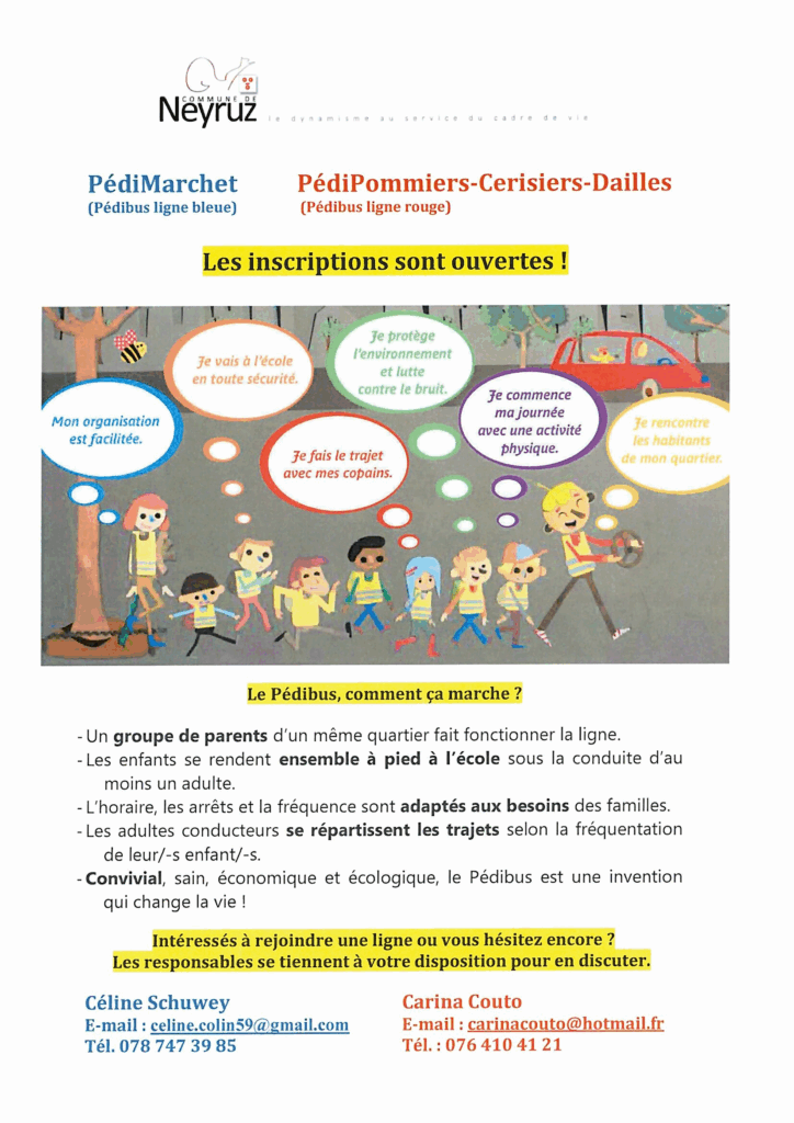 Ligne bleue : Pedimarchet : https://pedibus.ch/les-lignes/pedimarchet/. Le départ est à l’impasse du Rosset (borne électrique) – arrêt : début route du Marchet (bac à fleurs au début du trottoir de la route cantonale).